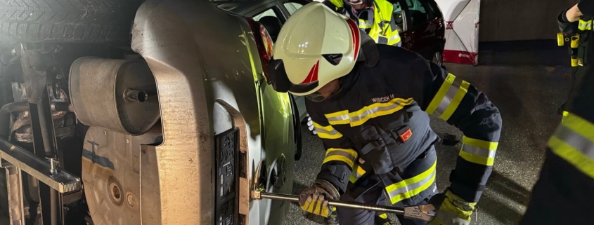 Bei dem Übungsszenario „Verkehrsunfall mit 3 eingeklemmten Personen“ wurde Hauptaugenmerk auf die schonende Rettung der verletzten Menschen, die dazugehörigen Rettungstechniken sowie das korrekte Arbeiten mit dem hydraulischen Rettungsgerät (umgangssprachlich Spreizer und Schere) gelegt.
